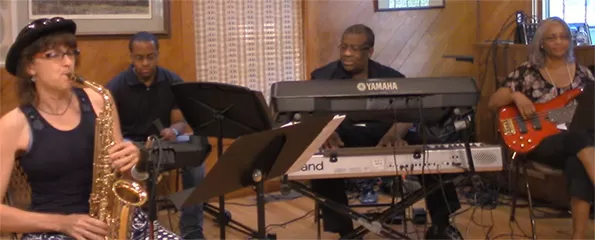 Family jazz group playing the song “Alone Together” at OLLI dinner featuring Mindy on the alto sax.